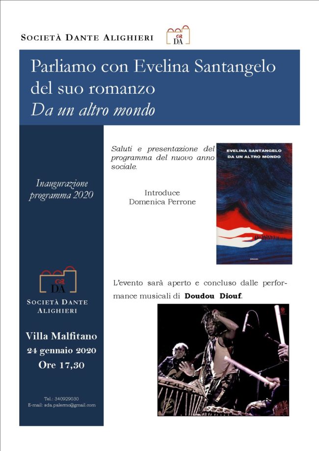Nell’incontro inaugurale del Programma Culturale 2020 della Dante di Palermo parleremo del romanzo di Evelina Santangelo, Da un altro mondo, e assisteremo alla performance del musicista senegalese Doudou Diouf. Vi aspettiamo il 24 gennaio 2020 alle ore 17.30 presso Villa Malfitano a Palermo.